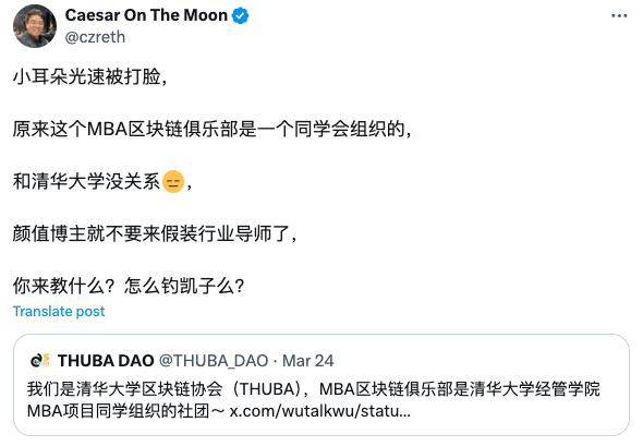 清华大学MBA区块链俱乐部这个名头看起来很厉害,但Nexus Fund 合伙人/总监/研究员Caesar On The Moon在推上怒喷:“小耳朵光速被打脸,原来这个MBA区块链俱乐部是一个同学会组织的,和清华大学没关系,颜值博主就不要来假装行业导师了”。