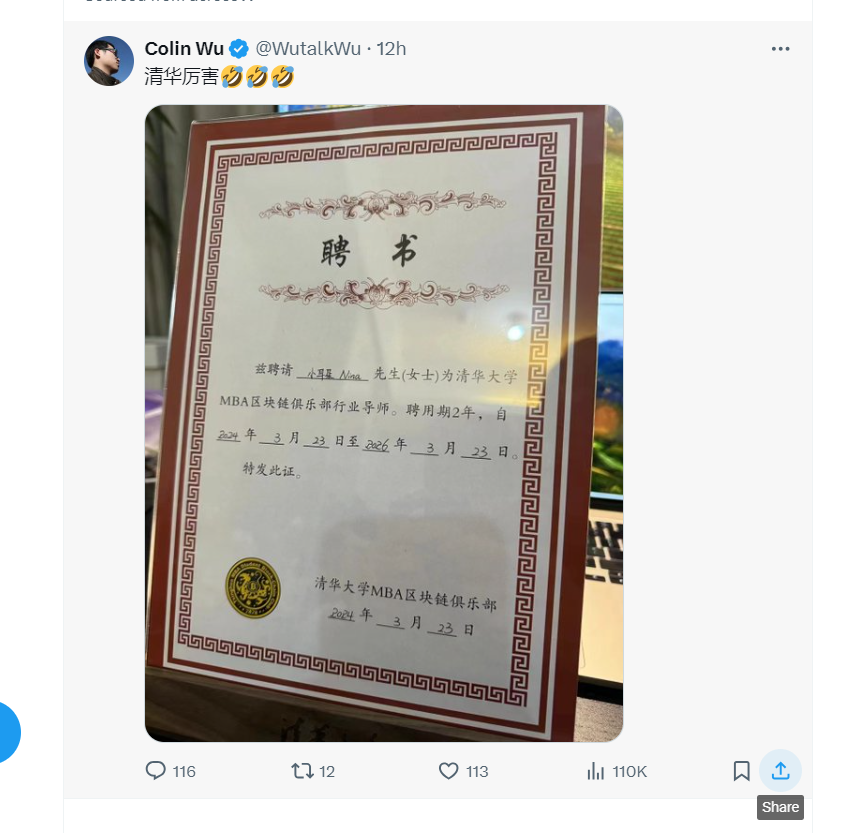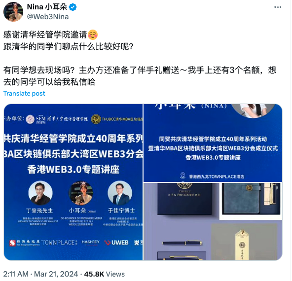她本人在推上感谢了清华经管学院,自称受邀参加该学院的香港WEB3.0专题讲座。一些网友调侃:“nina去给清华上上课”、“送清华录取通知书吗”......