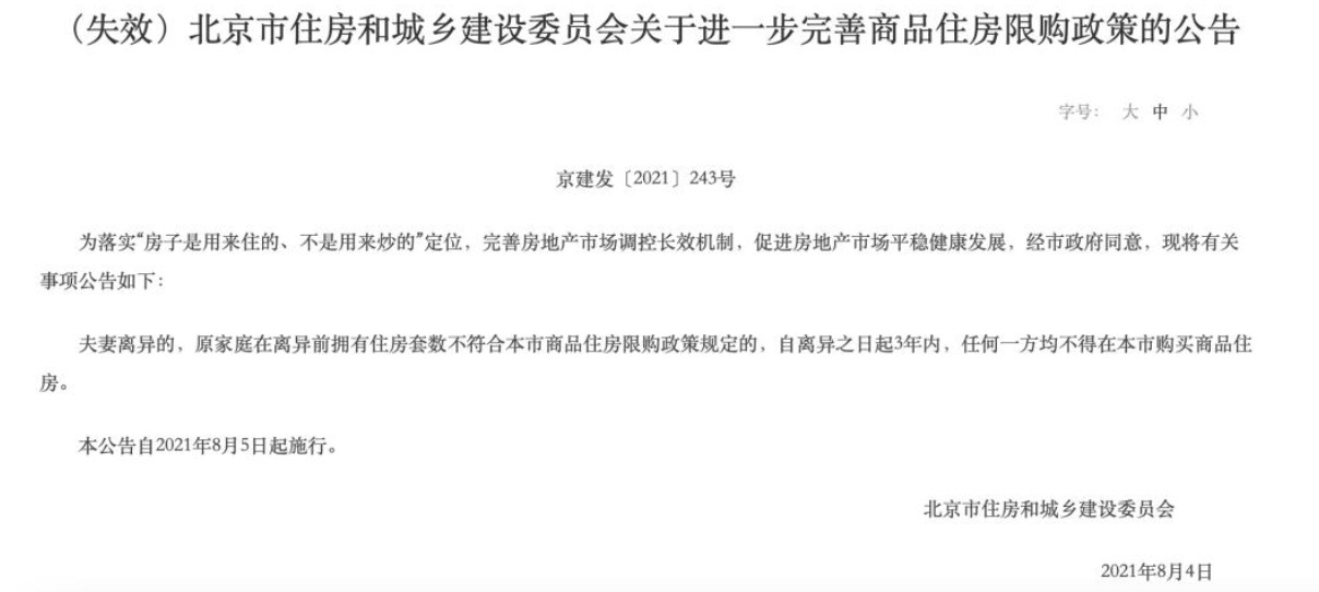 据北京市住房和城乡建设委员会消息,3月27日起,北京市废止“夫妻离异任何一方3年内不得购房”规定的有关文件。现有资料显示,上述政策发布日期为2021年8月4日,文件名为《北京市住房和城乡建设委员会关于进一步完善商品住房限购政策的公告》,依据失效时间,上述3年内不得购房的政策执行未满3年。