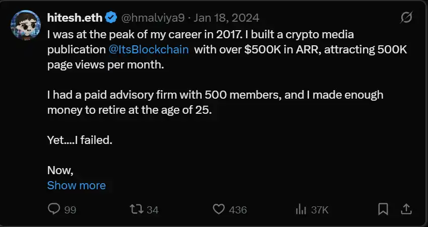 我告诉我的经理:「每天来办公室做些毫无意义的事情有什么意义?我待在家里,做一些有趣的事,能赚到我薪水的四倍。」从那时起,我将 @ItsBlockchain 从区块链转向了加密货币,专注于山寨币和 ICO。