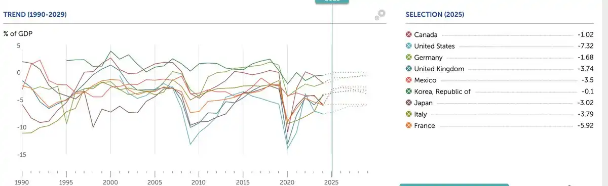 如下面的图表所示,在主要发达的西方国家经济体中,美国的财政赤字占 GDP 的比例远高于任何其他国家。