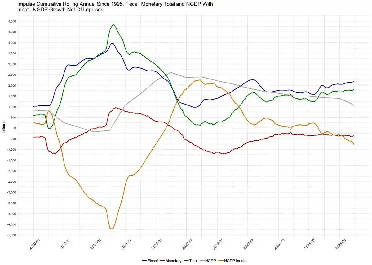 在大多数情况下,货币政策在风险资产活动中扮演次要角色,而财政刺激一直是主要驱动力。如 @BickerinBrattle 定期更新的这张图表所示,美国的货币刺激相较于财政刺激是如此微弱,以至于我在这次讨论中将其搁置一旁。