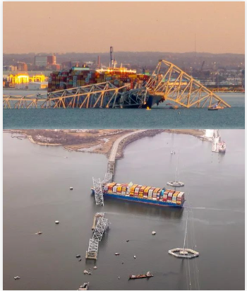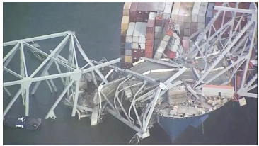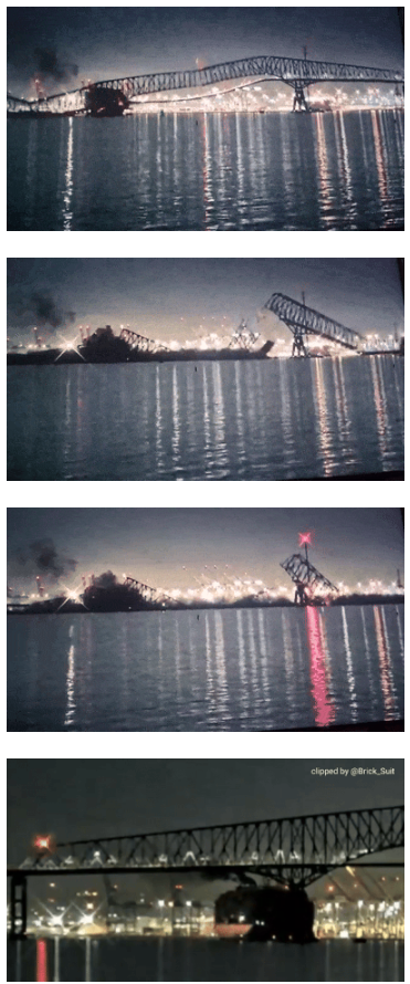 撞击后的画面宛如末日。大桥主跨度达1200英尺(366米),是世界上连续桁架桥梁中第三长跨度的桥梁,也是巴尔的摩都会区最长的桥梁。每年约有1150万辆汽车通过。