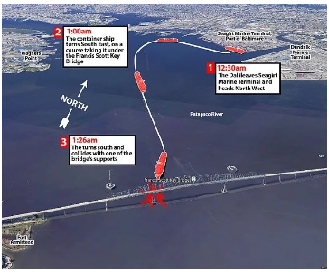 肇事货轮名为“达利”号(Dali),货轮管理公司Synergy Marine Group证实,这艘船在凌晨1点30分左右撞上了大桥的一个支柱,当时由一名或多名领航员控制。领航员是当地的专家,负责帮助船只安全驶入港口。