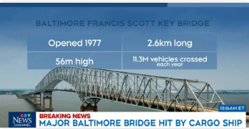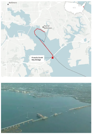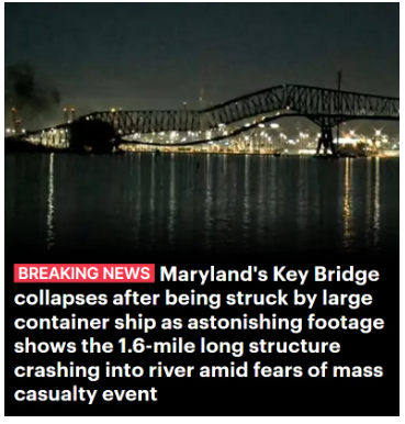 美东3月26日凌晨1点30分,美国马里兰州巴尔的摩市弗朗西斯·斯科特·基大桥(Francis Scott Key Bridge)被万吨巨轮撞塌了!