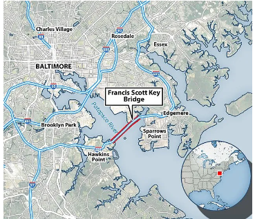Francis Scott Key Bridge于1977年投入使用,是该市的交通要道(695号州际公路)。桥下的Patapsco River(帕塔普斯科河)水路与巴尔的摩港口共同构成美国东海岸最重要的航运枢纽。