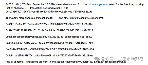 2020年的9月26日北京时间的凌晨2点51分,Kucoin收到异常报警,显示有异常的以太坊转账: