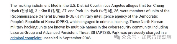这偷了这4,700枚比特币的是31岁的全昌赫Jon Chang Hyok、27岁的金日Kim Il以及36岁的朴镇赫Park Jin Hyok,是朝鲜民主主义人民共和国(DPRK)军事情报机构侦察总局(RGB)的单位人员,该机构涉嫌从事黑客犯罪活动。这些来自朝鲜的军事黑客组织在网络安全社区中有多个名称,包括Lazarus Group以及Advanced Persistent Threat 38(APT38)。其中Park此前曾在2018年9月未公开的刑事诉讼中受到指控。