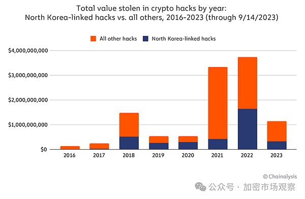 在朝鲜加密事业最红火的2022年,一年就赚了16.5亿美金,几乎全网一半的加密货币,都是朝鲜的黑客偷的。