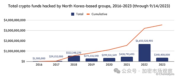 根据chainalysis的数据,朝鲜的加密业务开展的十分顺利,截止23年9月,已经累计赚取35.4亿美金的加密货币。