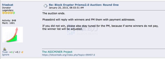 2012年,在比特币官方论坛 bitcointalk上,烤猫(friedcat)发表一篇帖子声称可以制造 ASIC 矿机。 但他并没有足够的启动资金。