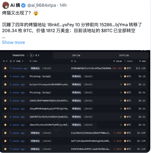 沉睡了四年的烤猫地址 1BnkE...yxFey 向 15286...bjYma 转移了 206.34 枚 BTC,价值 1812 万美金。